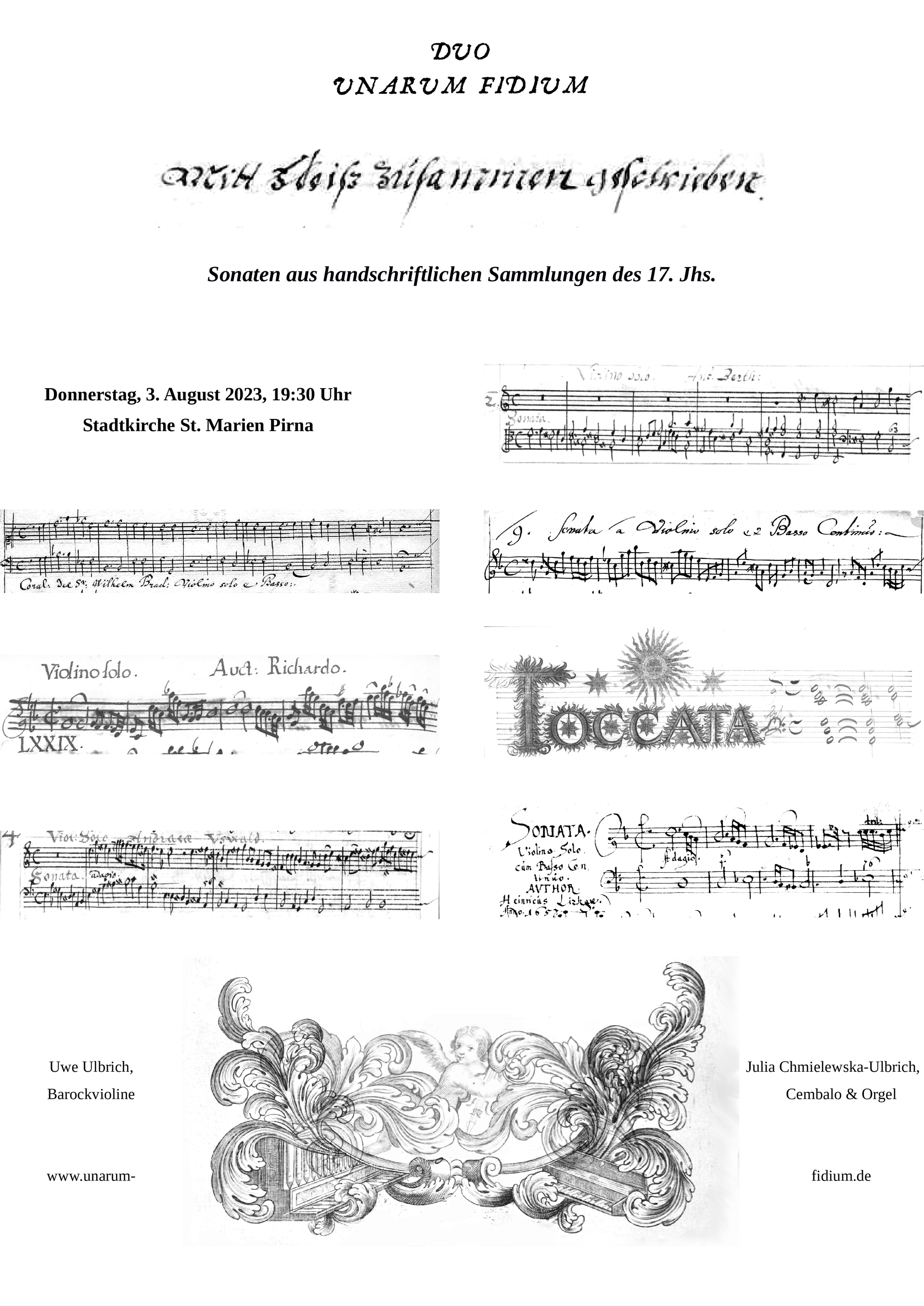 Kurzfristig springen wir bei einem Konzert im Rahmen des 12. Musikfest UNERHÖRTES MITTELDEUTSCHLAND 2023 ein und haben dafür ein neues Programm zusammengestellt, welches nur Werke von Komponisten enthält, die in Mitteldeutschland lebten oder wirkten. Unerhörte Geigenschätze -- am 01. Juli 2023 16:00 Uhr in der Salvatorkirche Gera Duo Unarum Fidium Uwe Ulbrich, Barockviolinen Julia Chmielewska-Ulbrich, Cembalo Carlo Farina , Andreas Oswald, Johann Caspar Kerll, Johann Jakob Walther, Georg Philipp Telemann und natürlich Johann Sebastian Bach werden zu hören sein. Karten: 15 € | ermäßigt 12 €